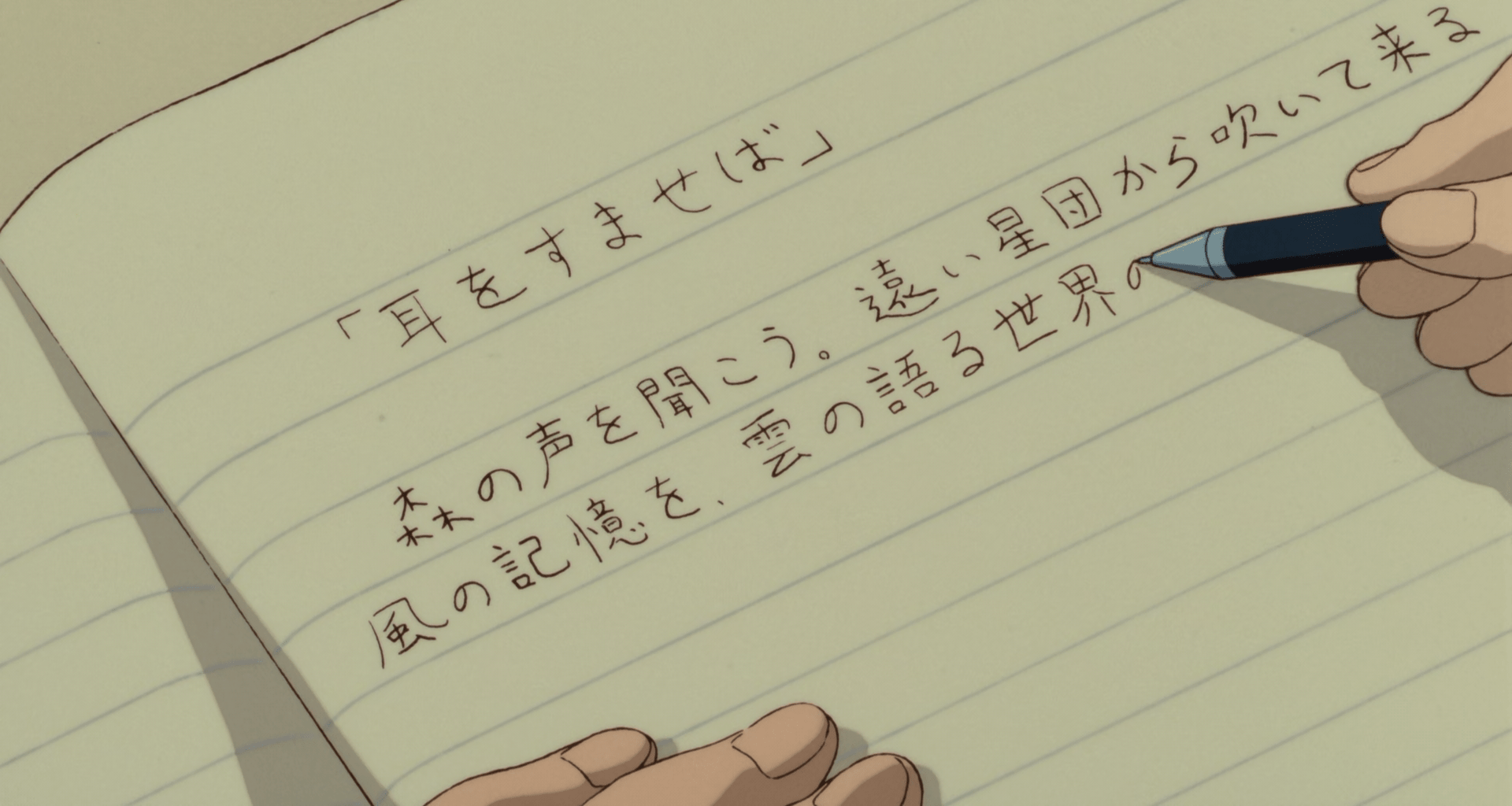 귀를 기울이면은 1995년 나온 작품이지만 이 애니 속의 배경은 그보다도 오래된 80년대 후반에서 90년대 초반 같은 느낌이었다. 나는 시골에서 살았기 때문에 저런 도시의 모습을 전부 공감할 수는 없지만 뉴스에서나 보던 옛날 주공아파트 같은 모습이나 거리의 모습은 이상하게 친숙하게 느껴진다. 그 외에도 이 시절에 볼 수 있는 집안의 모습, 학교에서의 모습들이 내가 겪었던 학창 시절의 모습을 너무 잘 반영하여 괜히 마음이 편해진다. 힐링 애니로써 너무나 그 역할을 잘 해내고 있는 느낌이다. 그림체도 작은 문방구안에서 판매하는 노트의 표지와 같은 느낌이어서 더욱 친숙했다.